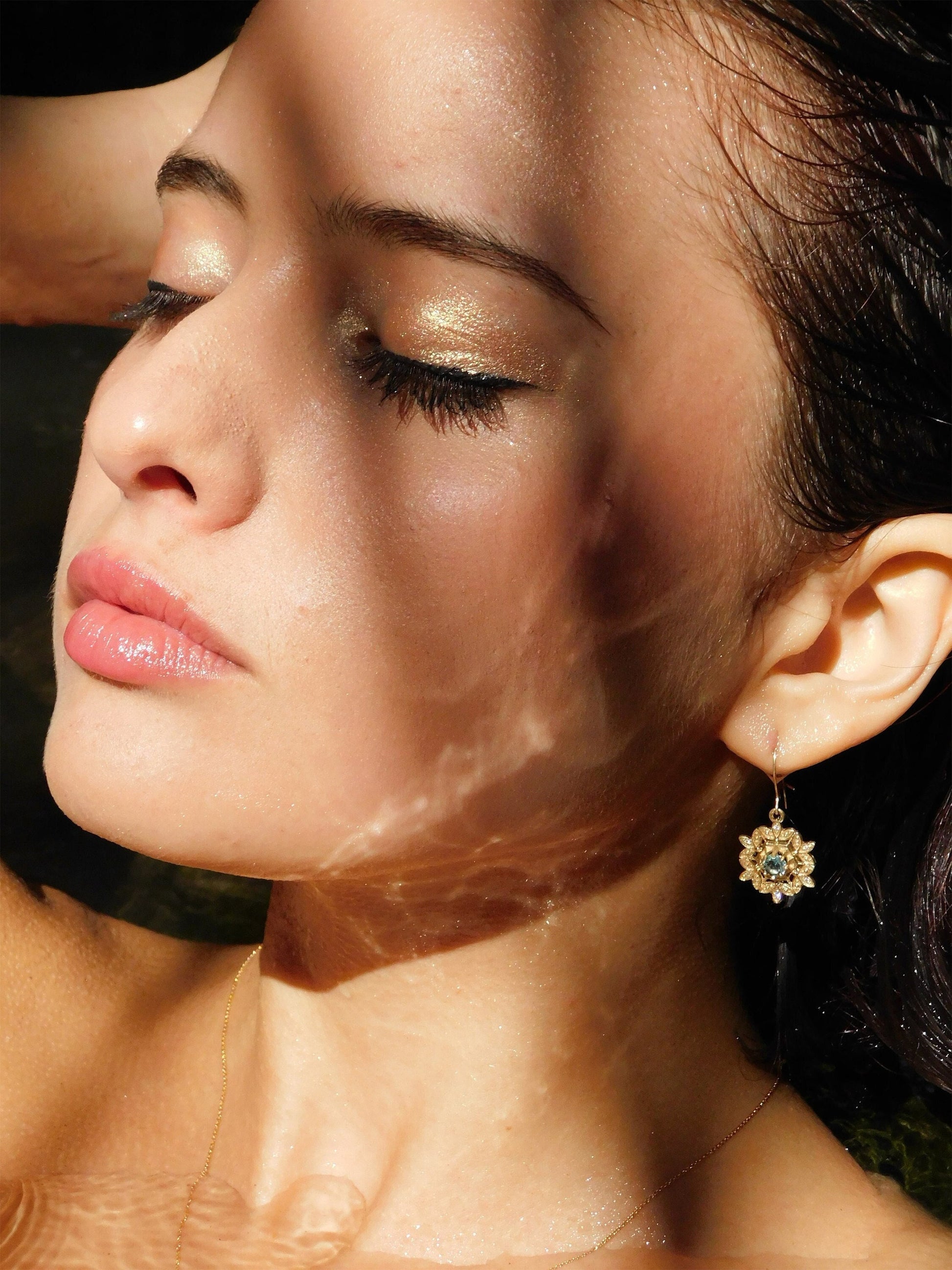 'You are beautiful'- luxurious 14 k gold water crystal dangle earring with blue topaz gemstone and diamonds